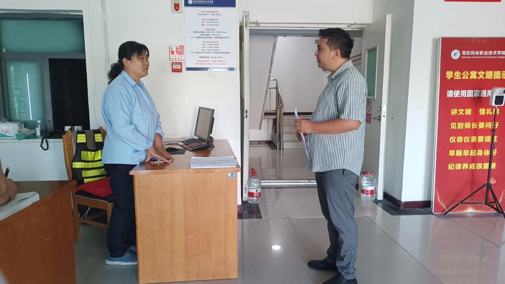 会后,马哈木提江·米吉提带领全体辅导员走进B1学生宿舍公寓楼,就宿舍安全、卫生和消防工作进行了检查,确保新生能有一个温馨整洁的宿舍环境。