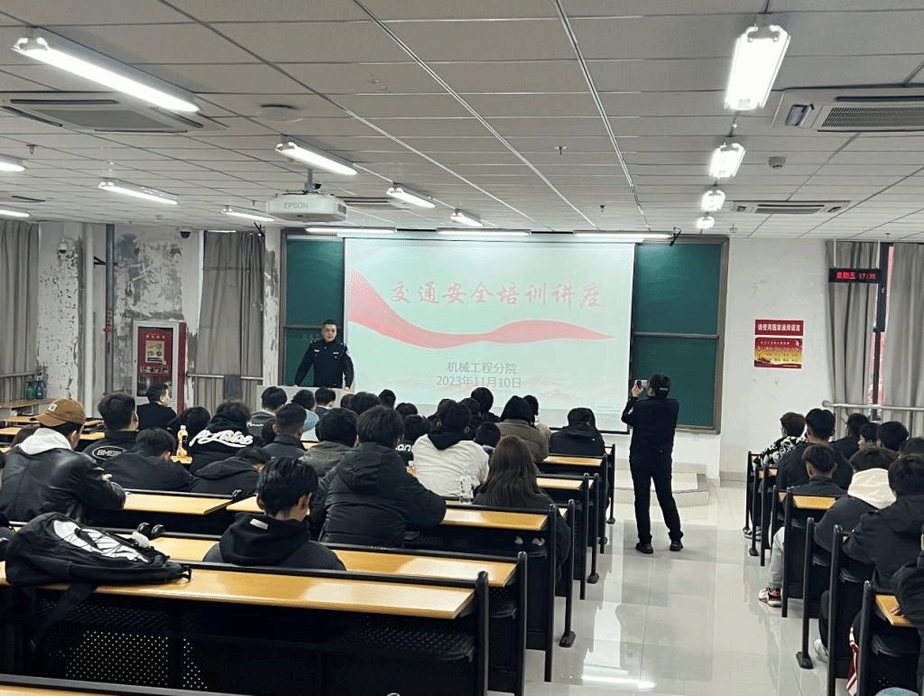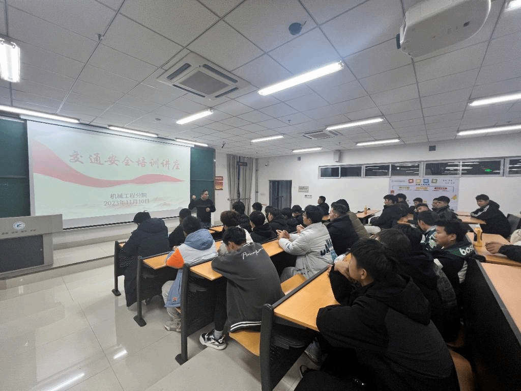 为深入学习贯彻党的二十大精神和总体国家安全观,加强学生交通安全教育,增强学生交通安全意识,11月10日下午,机械工程学院邀请市公安局克拉玛依区分局交警大队民警铁龙、张倩为在校167名持有机动车驾驶证的学生开展了交通安全知识培训讲座,院安保处王丽老师、分院副院长马哈木提江前往会场聆听了讲座。