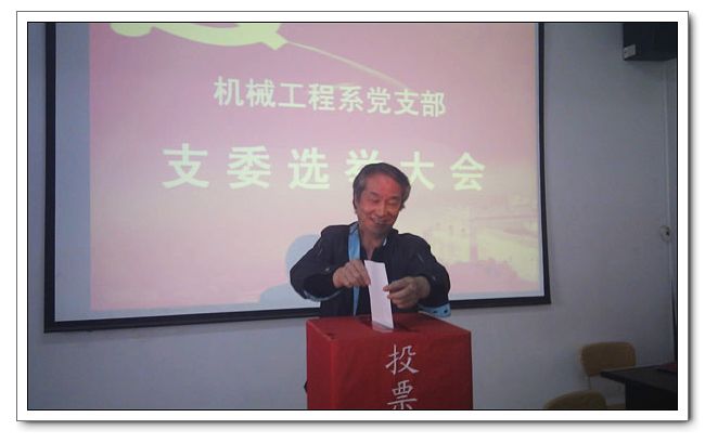 到会的全体正式党员根据《中国共产党章程》、《中国共产党基层组织选举工作暂行条例》的要求进行选举。选举采取无记名投票的方式,机械工程教研室刘胜文老师监票,机械基础教研室韩志明老师记票。经过与会党员同志的投票,最终大会选出李继霞同志、周永新同志、刘少华同志、王迪同志、朱晏萱同志为机械工程系党支部委员。