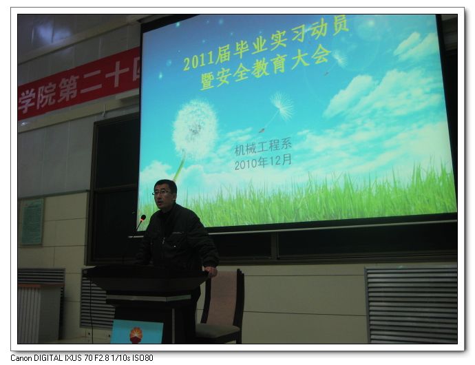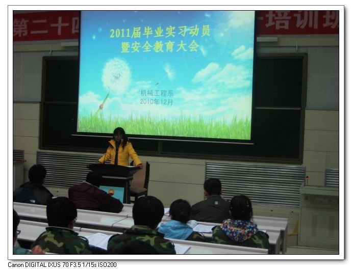 为了帮助2011届毕业生明晰实习目标,适时调节学生心理状态,并以高涨的热情完成圆满完成毕业实习任务,12月28下午机械工程系召开了2011届毕业生毕业实习动员暨安全教育大会,机械工程系主任周永新、支部书记李继霞、教研室主任毕启玲、指导老师加米纳、辅导员刘少华、毕业班班主任林报钦、朱晏萱、阿不力甫以及全体毕业生参加此次大会。