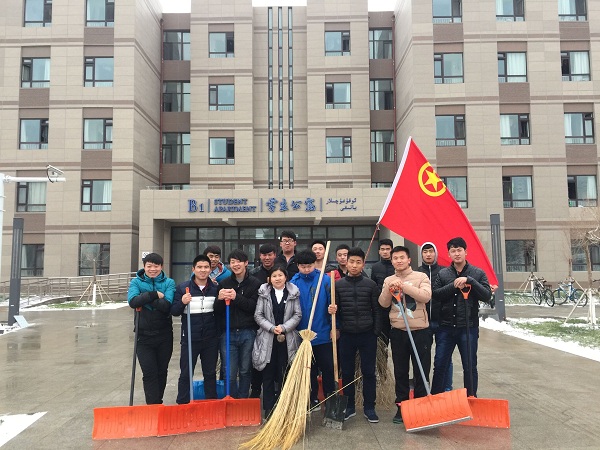 12月7日,化机1432班班委组织同学们在B1宿舍楼附近开展志愿者扫雪活动,为B1宿舍楼及来往师生的出行提供便利。