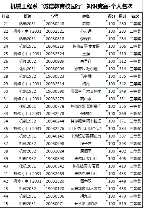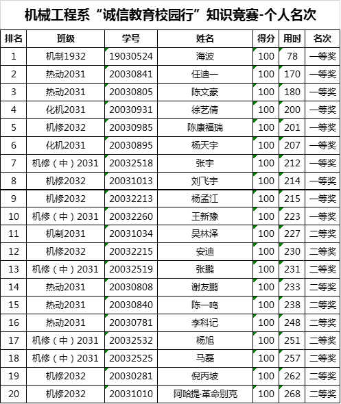 机械工程系“诚信教育校园行”知识竞赛-个人名次: