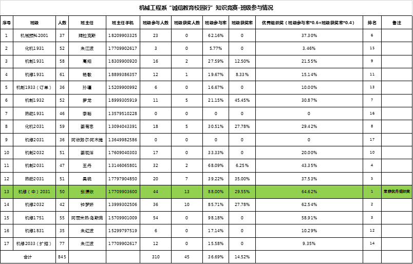 机械工程系“诚信教育校园行”知识竞赛-班级参与情况及优秀组织奖: