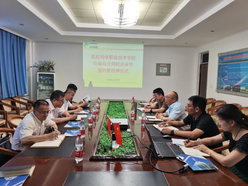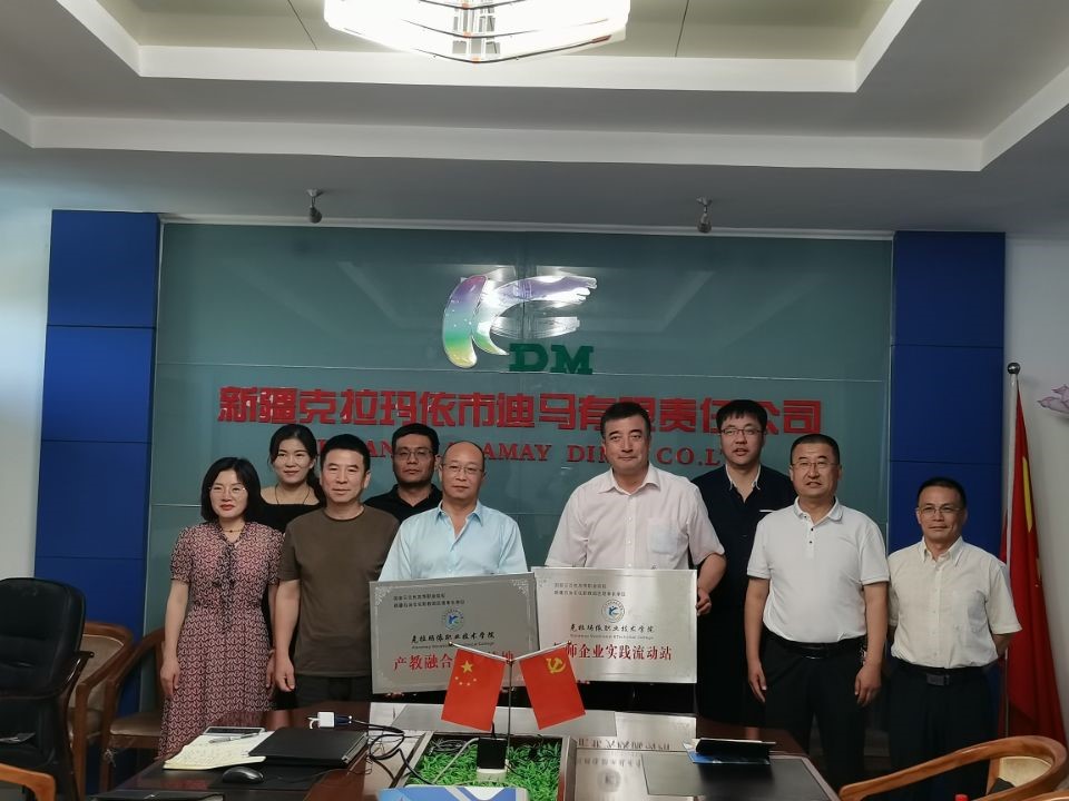 学院党委副书记、纪委书记扎克•司马义介绍了学院的发展情况,就拓宽就业渠道、拓展就业岗位、开展实习实训、加强就业指导等方面与企业领导进行了深入交流,并代表学院与企业签订了《产教融合校企合作协议》,与企业领导一起为克拉玛依职业技术学院产教融合实训基地和教师企业实践流动站进行了揭牌。