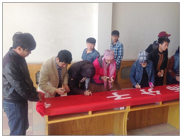会议结束后全系学生在俱乐部门口举行横幅签名仪式。李继霞老师在签名前进行了讲话,要求各班级师生都要对维护新疆的和谐与稳定这项当前最重要的政治任务高度重视,要坚定态度,同学们也纷纷表示对恐怖行径的强烈谴责并在“声讨暴力恐怖分子,争做民族团结先锋”的横幅上签上自己的名字。