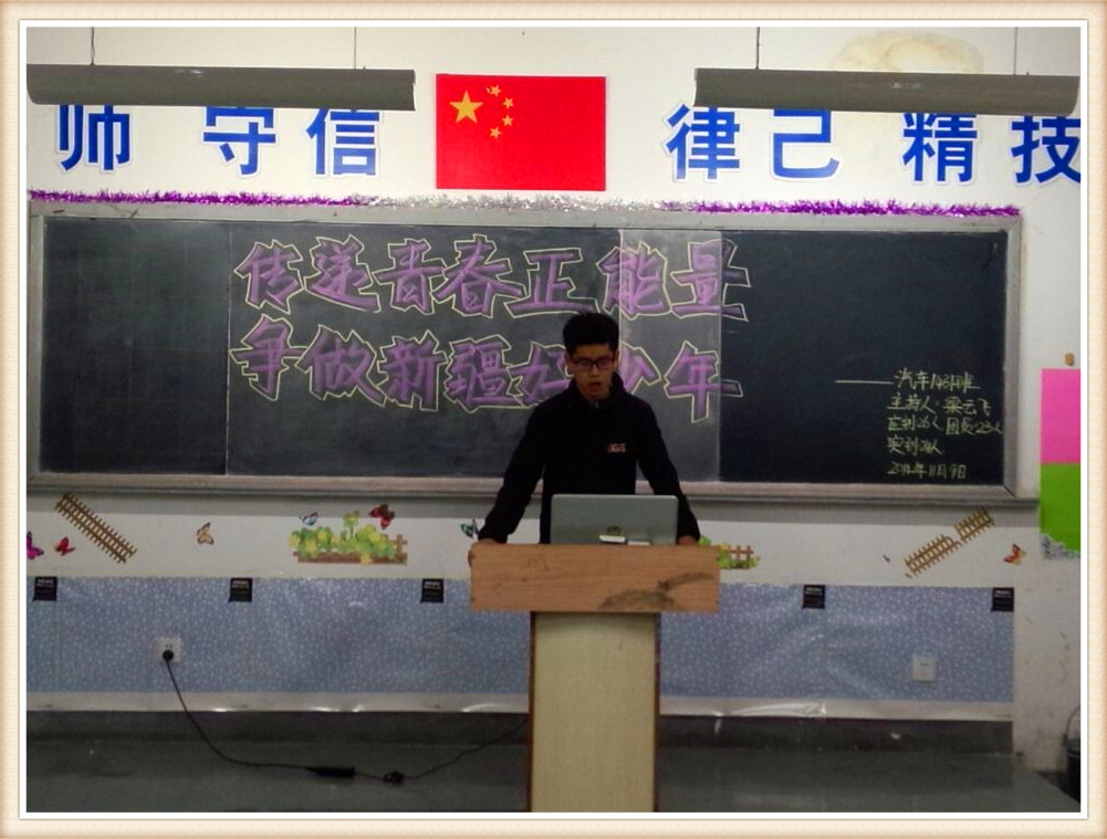 伴随着一首《年轻的战场》开始了汽车1431班的本期主题团课。团课围绕“传递青春正能量,争做新疆好少年”进行,事例生动形象,现场气氛活跃。