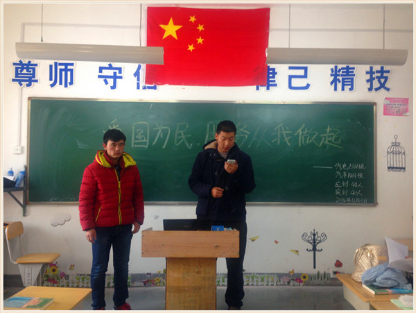 热爱祖国,服务于人民是中华民族的传统美德。为了让同学们从实践中来到实践中去,通过社会实践活动使同学们成为理想远大,热爱祖国的人,成为追求真理勇于创新的人,成为德才兼备,全面发展的人成为言行统一,脚踏实地的人,成为社会主义现代化建设服务的一线尖兵。汽电1331班,汽车1431班在班主任钟梦娇的带领下于2014123日在2204教室开展了此次德育活动课。