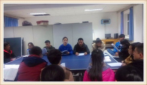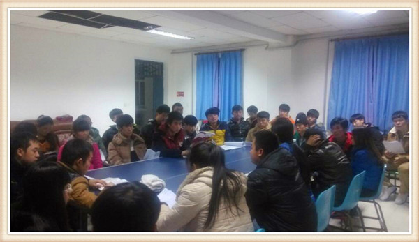 2014123日晚上九点机械工程系团总支书记钟梦娇和党支部书记助理高玉宏在系部大办公室带领第三十二期党课学员考前抽背复习。