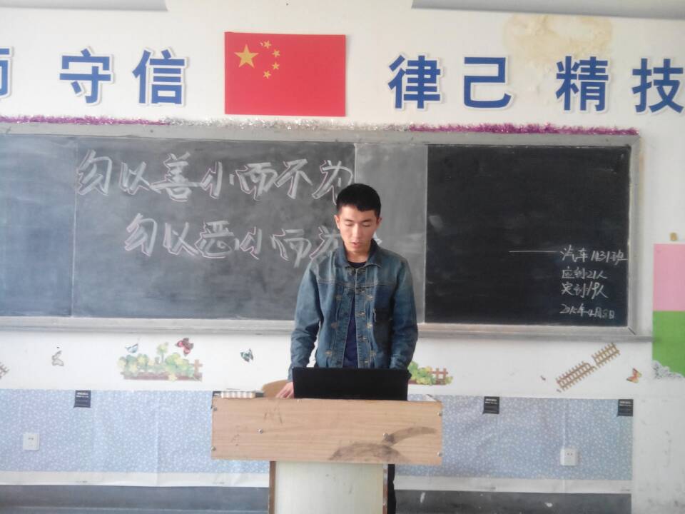 汽车1431班于2015年4月8号开展了一期的"勿以善小而不为,勿以恶小而为之”的主题德育课,在主持人杨帆南极的引导下,同学们懂得了这一主题的含义,并了解到了在以后的生活中该如何去改正自身的不足之处。另外,在这堂课中,主持人用了四十道问题,其中20道与少数民族习俗有关的问答题,20道与汉族习俗有关的问答题,在这场问答游戏环节中,同学们懂得了互帮互助,在各民族习俗的问题中明白了应该要注意的问题。本次德育实践课上,同学们学习到相关的知识,勿以善小而不为,一个微笑便可以驱散寒意,一声问候便可以拉近距离,同样一件好事便可以看出一个人高尚的品格,纯净的心灵。小事为大事的基础,大事由小事而累积。轻视一滴水的存在,又怎么会有浩瀚波澜的海洋?轻视一棵树的存在,又怎么会有茂密丛生的森林?轻视一土一石的存在,又怎么会有缠绵万丈的山峦。轻视一件件平凡的好的小事,又怎么会做出伟大的事?