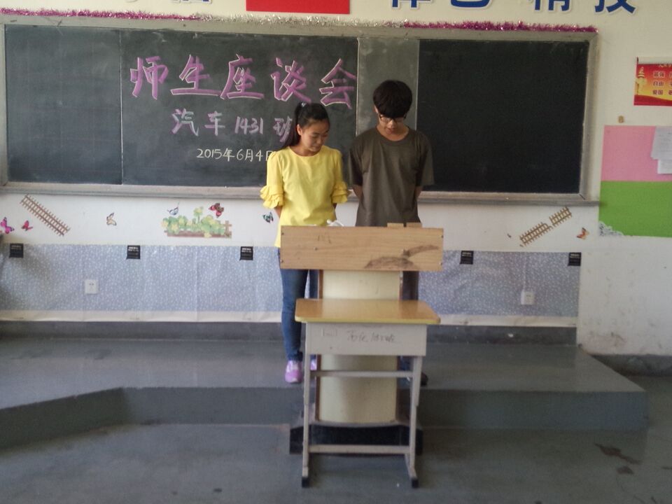 2015年6月4日,汽车1431班组织并开展了一次有意义的师生座谈会,参加会议的有机械工程系党支部书记李继霞老师,辅导员钟梦娇老师,各任课老师,各科课代表及汽车1431班全体同学。此次会议反响较好,得到了师生的一致肯定。