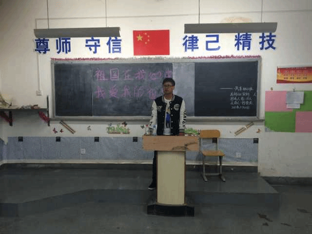 活动中,主持人何佳龙的讲到,我们生长在祖国和平年代是我们的幸福,成长在祖国的美好今朝是我们的自豪。多少年来,我每当看到鲜艳的五星红旗冉冉升起的时候,每当听到激越的《义勇军进行曲》高亢奏响的时候,一种振奋、一种激昂、一种骄傲、一种自豪的心情就油然而生。 生在新疆的我们更是可以感觉得到祖国的温暖怀抱。在,接着,全班同学有朗读诗句的,有唱歌的,有演小品的,他们用各种形式表达了自己的爱国情怀。