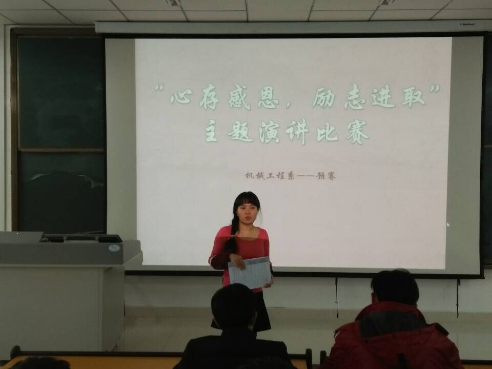 2015年12月16日下午,机械工程系团总支开展了 “心存感恩,励志进取”演讲比赛,本次比赛于C6-I-408室举办。参赛的13位选手是来自机械工程系的大一、大二各班级同学。辅导员张潇依老师,以及金莫、杨柏强两位学生为本次比赛的评委。