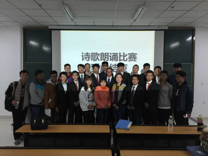 比赛开始前主持人董苗宣读安全预案,随后选手依次上台朗诵。比赛中选手们声情并茂、富有号召力的朗诵,嬴得了现场评委、同学们的阵阵掌声,现场掀起阵阵的高潮,比赛在激昂向上的氛围中进行,气氛热烈。参赛选手精彩的朗诵带着现场观众的思绪回了那个苦难年代,中国青年奋起抗争的峥嵘岁月。在激烈的比赛过后获得校园歌手大赛第一名的王海林同学为大家献歌一曲,缓解现场的紧张气氛。最后主持人宣读获奖名单,由钟梦娇老师、张萧依老师进行颁奖,并与获奖人员进行合照。