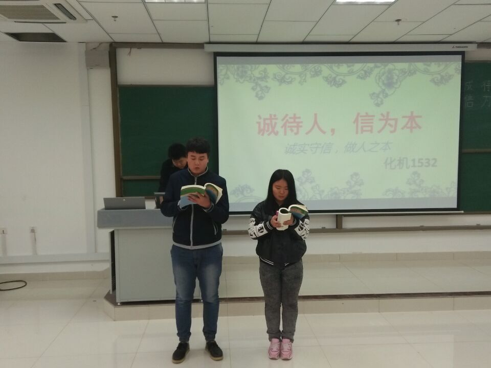 11月25日,机械工程系化机1532班在C2-II-103开展了以”诚待人,信为本”为主题的德育活动课。本次德育课由盛杰和李倩如同学主持,化机1532班全体同学参加。