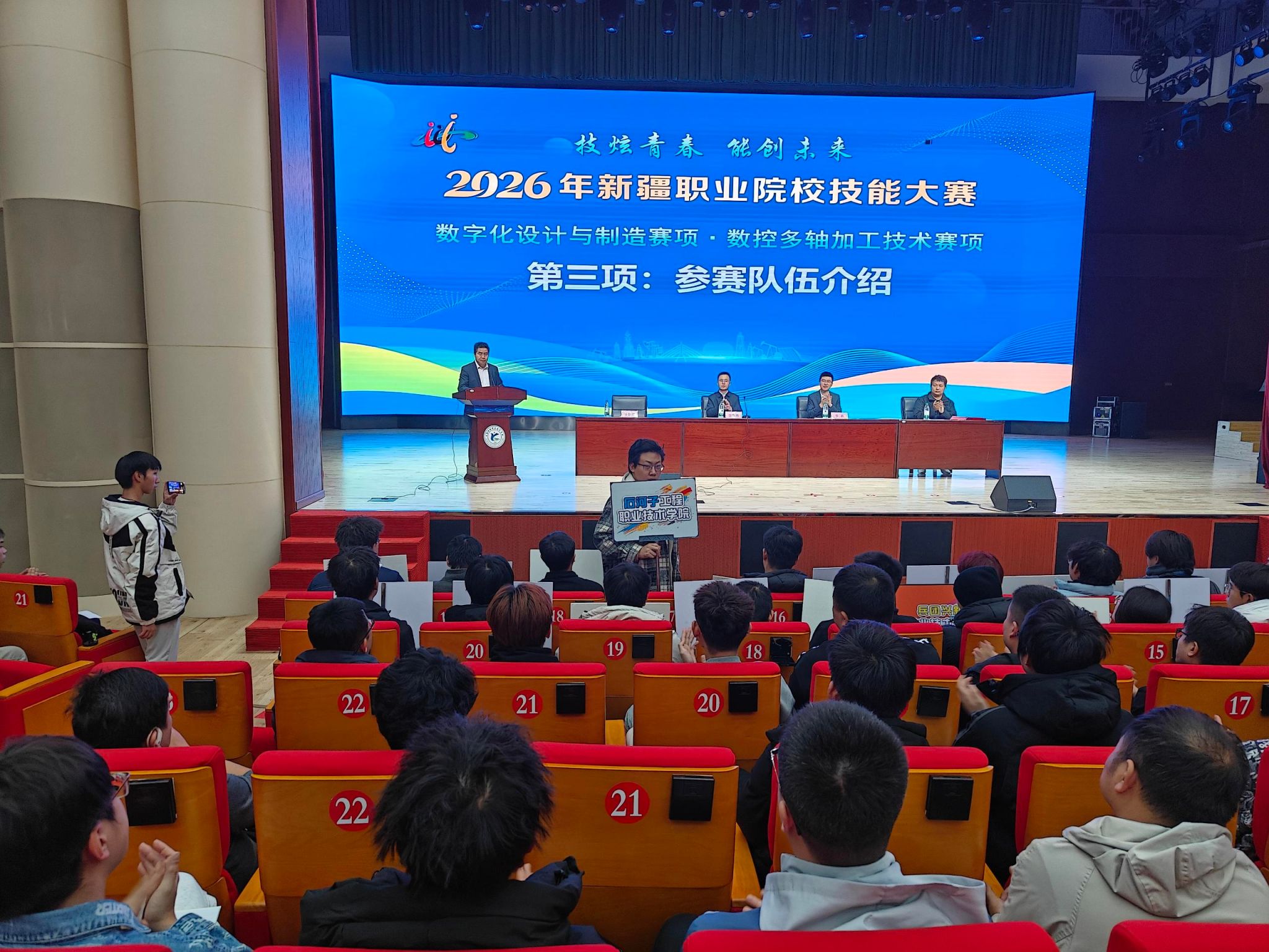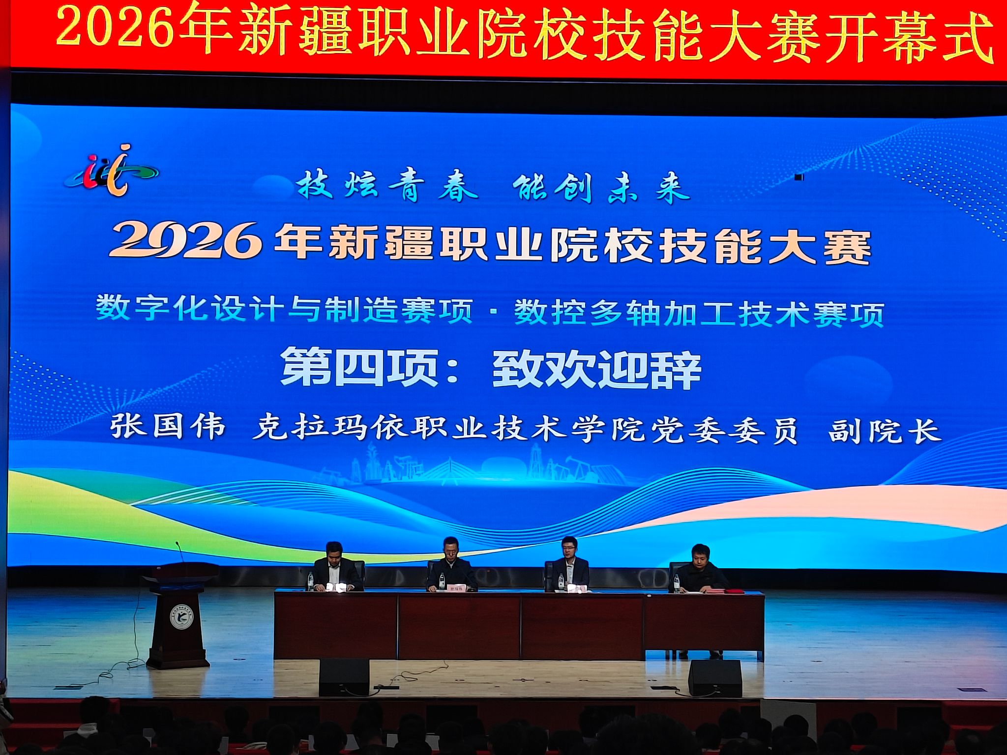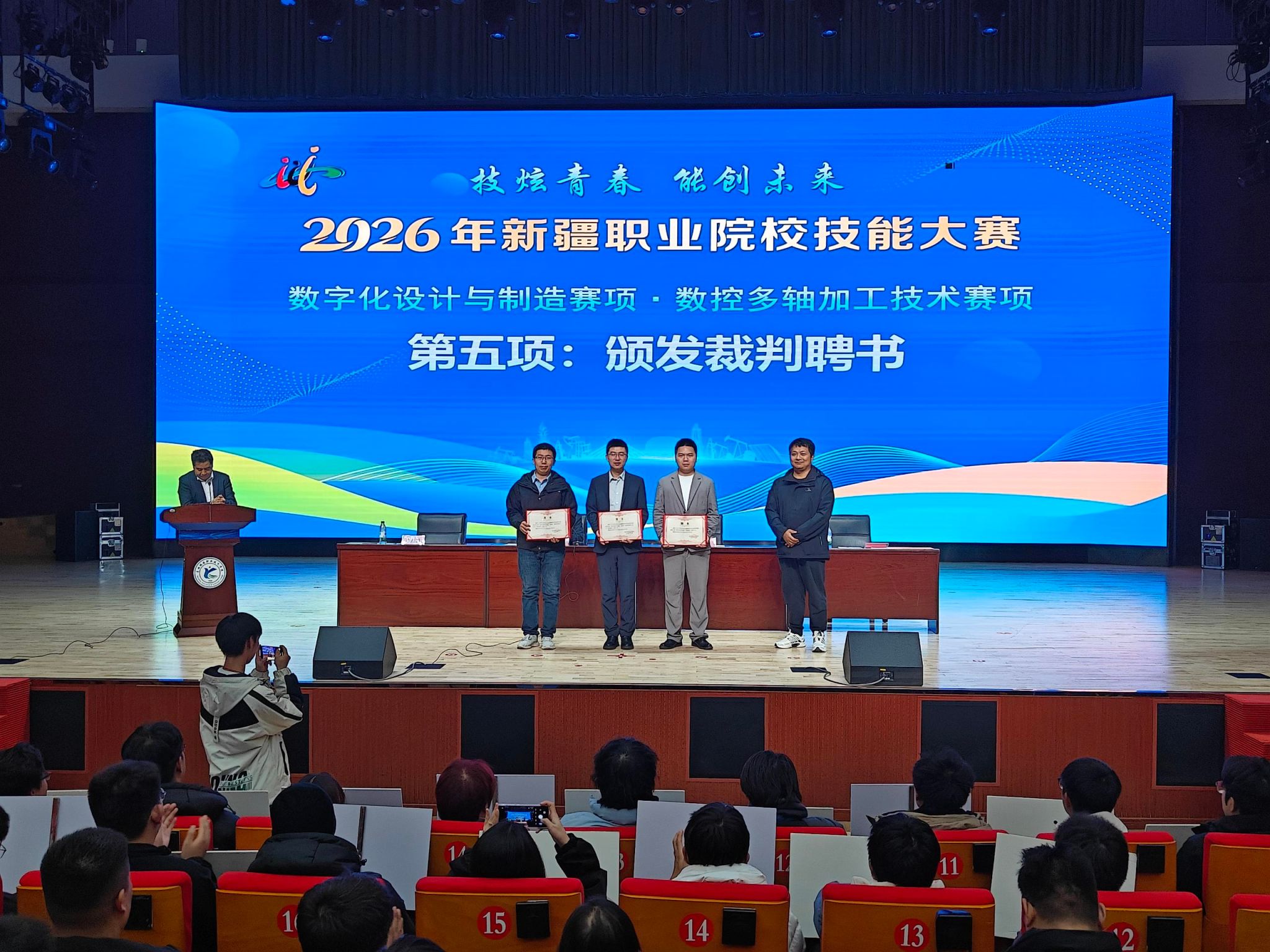 11月5日下午,由学院机械工程分院承办的2026年新疆职业院校技能大赛“数字化设计与制造”赛项在学院隆重开幕。本次大赛以“技炫青春 能创未来”为主题,旨在弘扬工匠精神、深化产教融合,推动职业教育高质量发展。