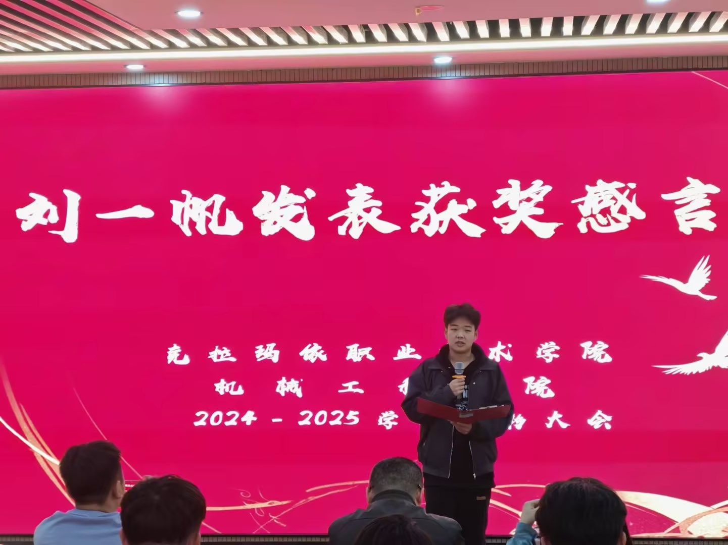 优秀学生代表刘一帆发言,讲述了他从入学迷茫、攻克学业及能力提升经历,感恩学校师生,鼓励同学们逐梦前行。
