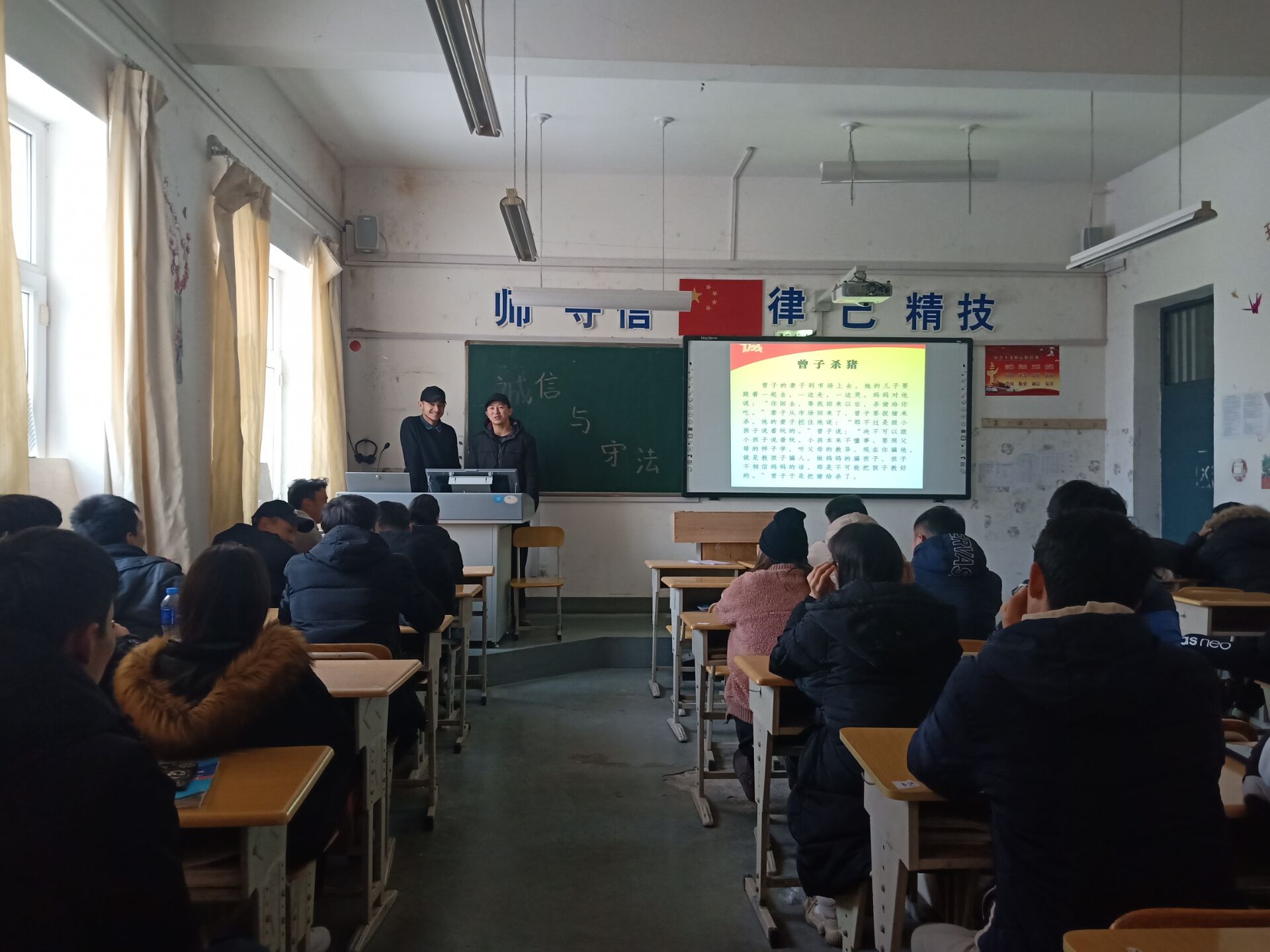 2018年11月28日,独山子区机械工程系汽电1831班在2103教室组织上了德育课,参加此次德育课的是于秀祥老师和汽电1831全体学生。 此次德育课的主题是《诚信与守法》由马吉主持。一∶诚信.即诚实守信,“诚”就是内城于己,诚实无欺,诚信做人,诚信做事,实事求是。“信”就是外信与人,有信用,讲信誉,守信义,不虚假。二∶诚信的重要性,对人,人之根本,不讲诚信,人无法立于世。对于社会,社会之根基,没有诚信,社会将无法正常运转。
