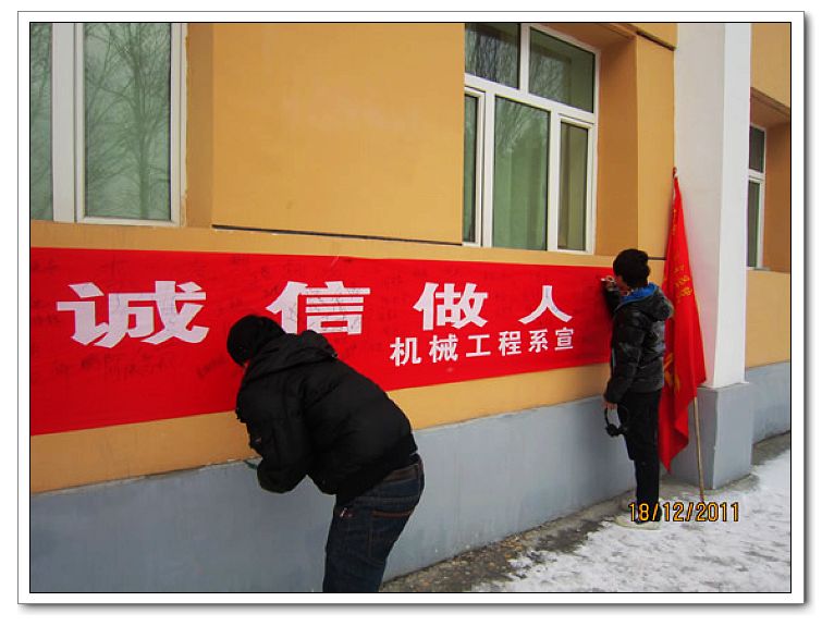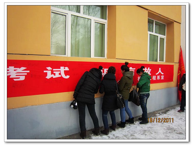 诚信是一种美德,是一种品质。诚实做人、诚信考试是学生最基本的素质要求。2011年12月18日,在B级考试之前,机械工程系团总支学生会在二号教学楼举办了“文明考试 诚信做人”签名活动。