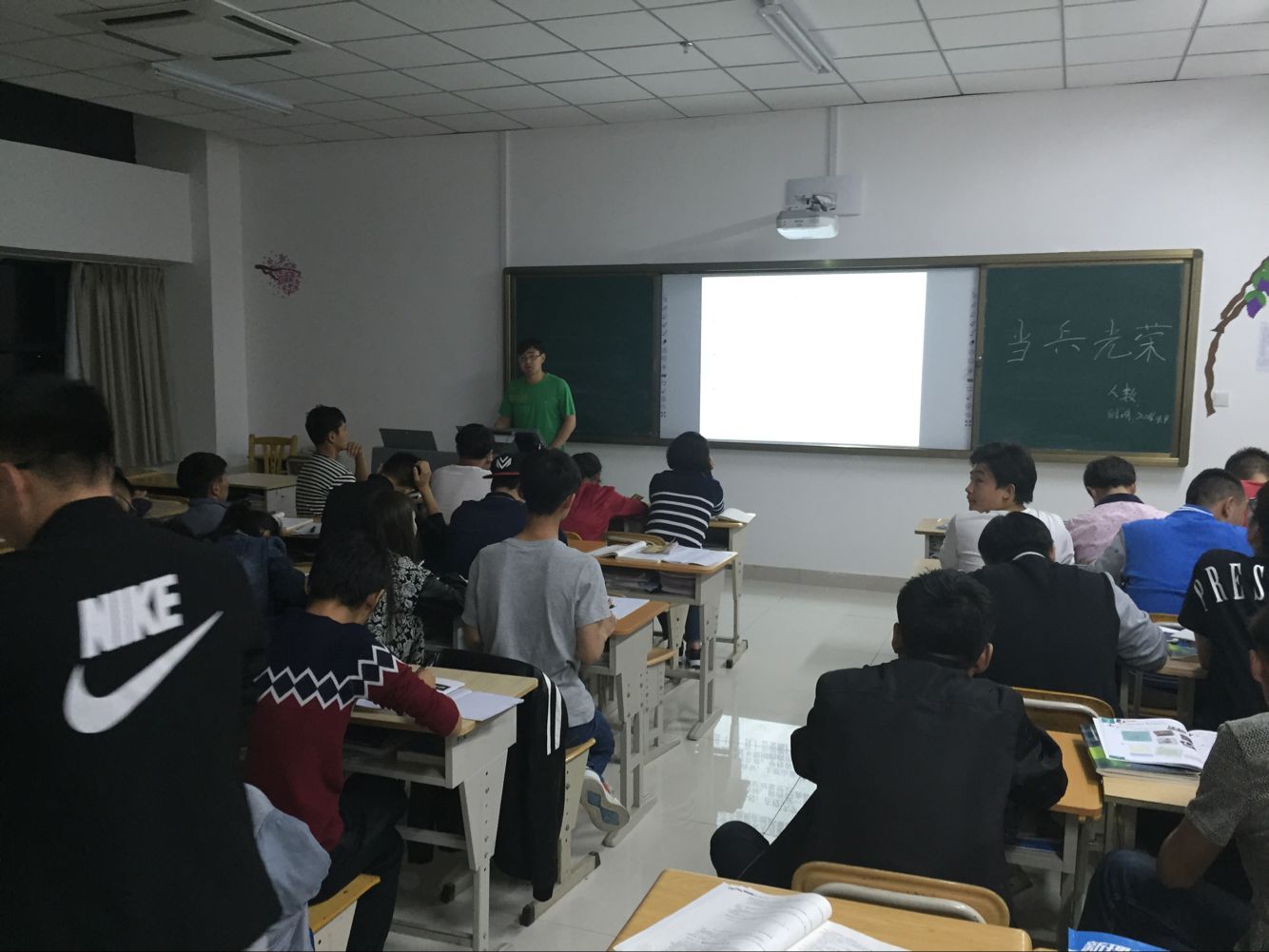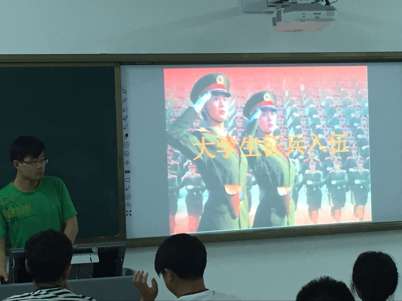 首先,主持人陈蛟龙同学以视频的方式,让大家了解了目前的国内形势,以此来激起同学们的报国之心。接着,又给同学们征兵入伍各项要求,虽然当兵很辛苦但它可以锻炼人的意志和身体。最后,同学们发表了自己对征兵入伍的看法,其中马铎同学讲到,好男儿志在四方,没有什么理由可以去阻止一个热血青年报效祖国。