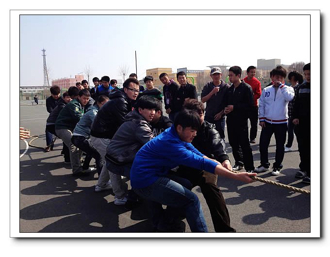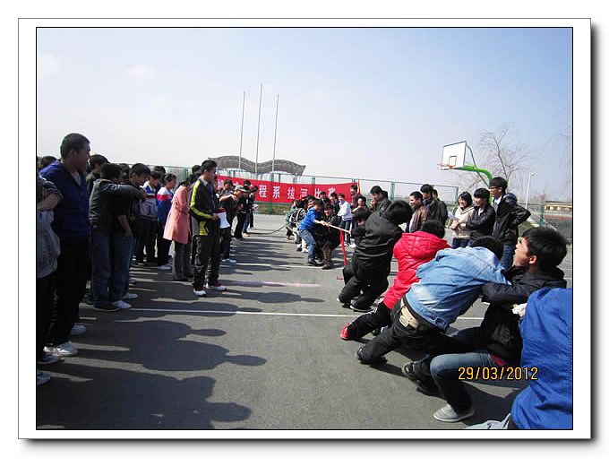 2012年3月29日中午13:40分,机械系拔河比赛第二轮晋级赛在篮球场上火热进行。参加第二轮争夺赛的是化机1031班、机制1031班、焊接1031班、化机1131班和焊接1131班。本次比赛,采用抽签形式决定赛程,化机1031班轮空。