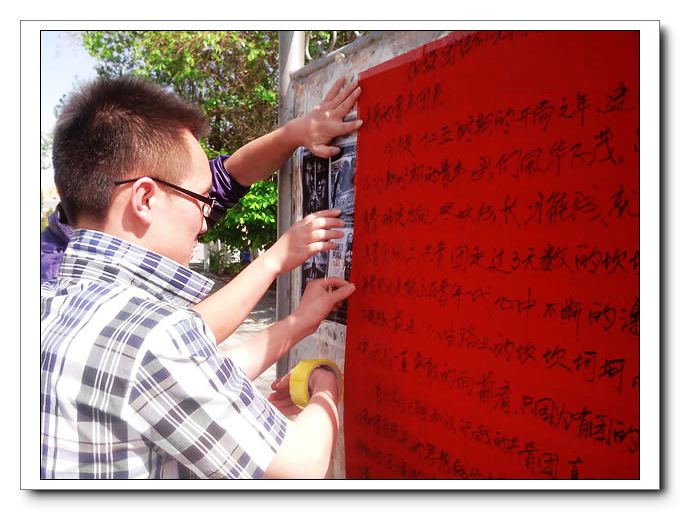 本次活动以全体团员重温入团誓词开始,接着以小组形式,发宣传单与撰写倡议书并且张贴到校园公告栏上。本次活动倡议校园内外的青年同学们把握青春,加强团信仰,尽快成长,为梦想奋斗。勉励各族青少年,要坚定信念,与我们的伟大祖国同呼吸共命运,促使参与同学要在今后的学习生活中,进一步发挥党员、团员的模范带头作用,勤奋学习、刻苦钻研、认真实践。为建设我们和谐校园,为创和谐新疆,为建设和谐祖国贡献自己的力量。