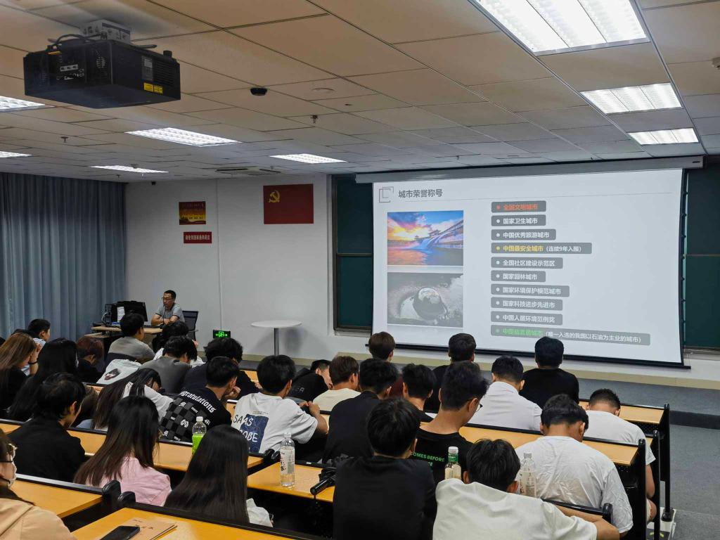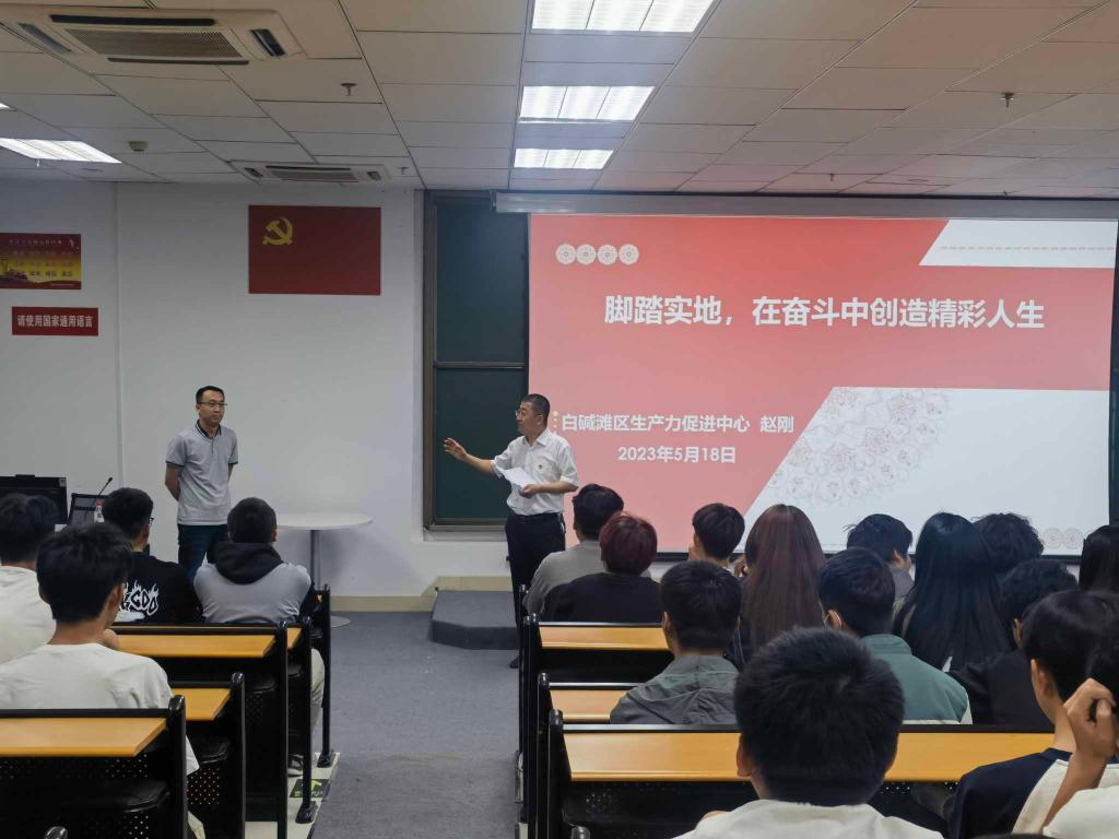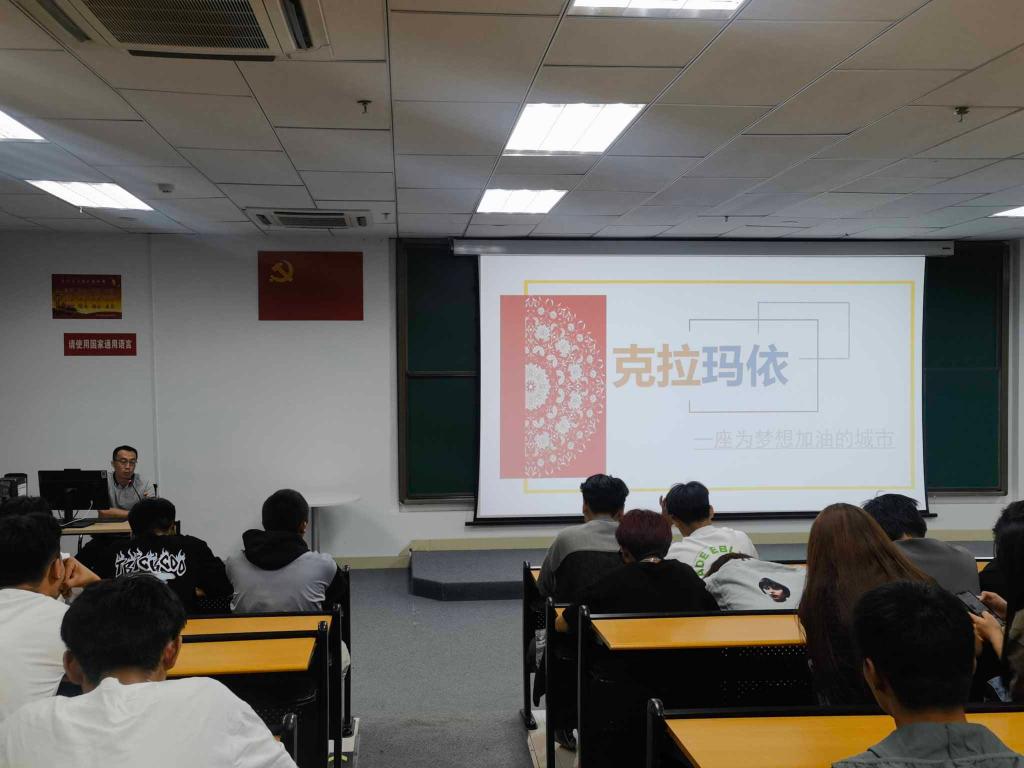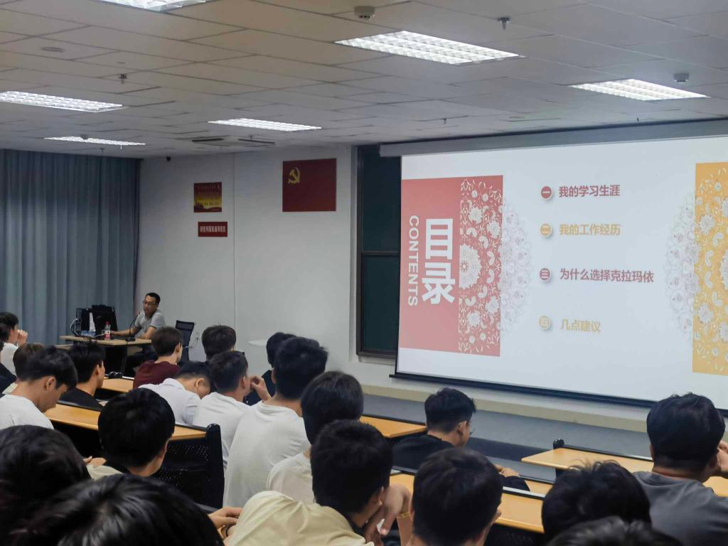 赵刚学长讲座的主题是“脚踏实地,在奋斗中创造精彩人生”。讲座中他给同学们分享了自己在我院求学成长及毕业后留在克拉玛依市工作的奋斗经历,讲述了自己如何从一名优秀毕业生成长为单位的一名技术主管,重点讲解了自己为什么选择留在克拉玛依市工作,介绍了克拉玛依市的城市概况,克拉玛依“一主多元”的产业发展格局、宜居就业的优势等。