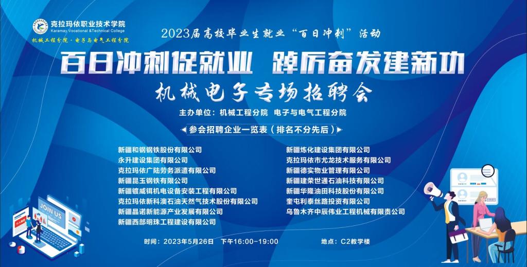 此次招聘会邀请到了克拉玛依广陆劳务派遣有限公司、克拉玛依市尤龙技术服务有限公司、克拉玛依新科澳石油天然气技术股份有限公司、奎屯利泰丝路投资有限公司、新疆建荣世通石油科技有限公司、新疆和钢钢铁股份有限公司、新疆华隆油田科技股份有限公司、新疆昆玉钢铁有限公司、新疆晶诺新能源产业发展有限公司、新疆炼化建设集团有限公司、新疆西部明珠工程建设有限公司、新疆德实物业管理有限公司、新疆镀威铒机电设备安装工程有限公司、永升建设集团有限公司、乌鲁木齐中辰伟业工程机械有限责公司共15家企业参加校园招聘,企业为学生提供500余个岗位,进一步满足机械与电气工程分院毕业生就业需求。