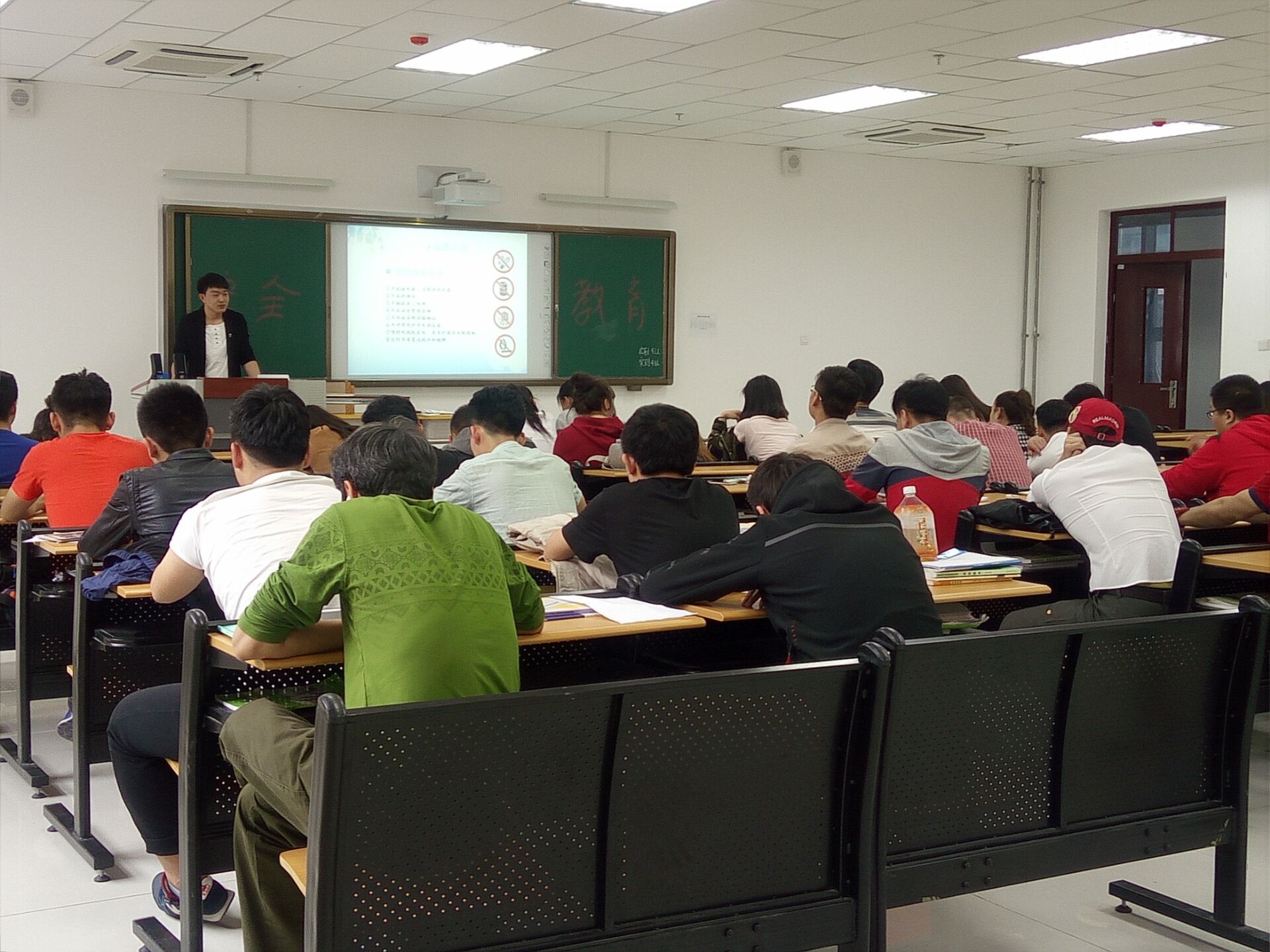 首先,王瑞同学为大家列出了大学生活最容易忽视的消防、交通、生活等方面的安全问题。接着,王瑞同学分析了大学生如今较为缺乏的社会经验、防范意识等问题。并围绕这些主题进行讲课,同学们讨论出宿舍应不乱接电源,不使用违禁物品等诸多实例,并防范火灾,增强自我防范意识,保护人生安全。最后,王瑞同学又讲述了一些真实的案例,使同学们加深印象,意识到安全的重要性。