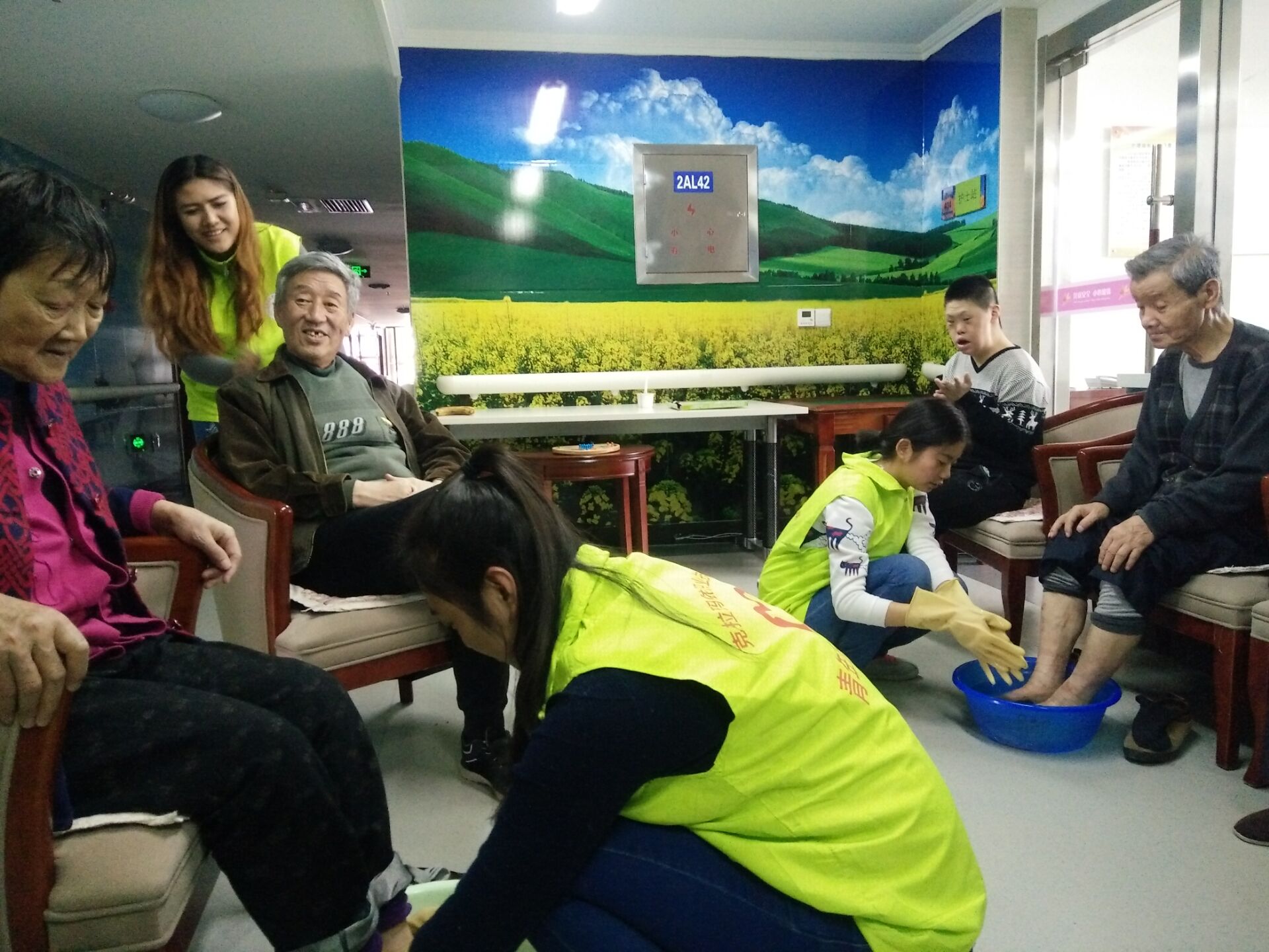 下午1540同学们踏着矫健的步伐带着一颗诚挚的心来到了黑油山敬老院,开展了本次的志愿者活动。在活动期间,诚挚热情的志愿者们与老人谈心,帮助他们整理内务、打扫卫生,耐心地为老人们捶背、洗脚、修剪指甲。此时,同学们已经把他们当做自己的爷爷、奶奶来细心照顾。随后,同学们也把动听的歌声和优美的舞姿带给了他们,并且陪老人们共进了晚餐。参加此次活动的同学们受到了老人们的热烈欢迎与高度赞扬。时间流逝,到了离别的时候,老人们湿润着双眼,舍不得志愿者们离开,在这几个小时里老人们都把志愿者们当做自己孙子、孙女。那沧桑的脸上也有了久违的笑容。