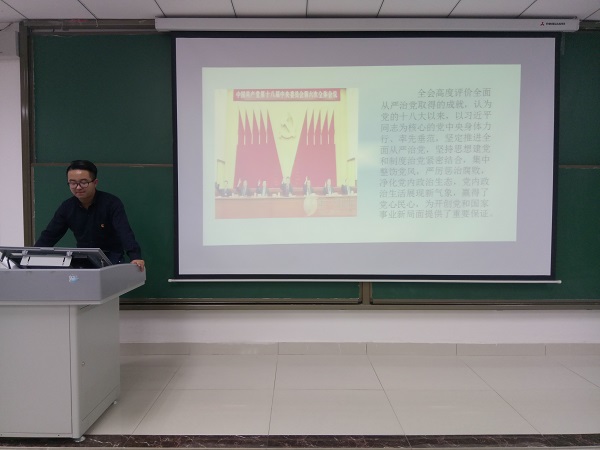 主持人茹敖年为大家介绍了十八六中全会召开的时间、地点以及会议审议通过了《关于新形势下党内政治生活的若干准则》《中国共产党党内监督条例》及《关于召开党的第十九次全国代表大会的决议》,标志着全面从严治党向制度化方向纵深发展,开启了全面从严治党的新时代。进一步增强“四个意识”,坚定不移推进全面从严治党,深入开展巡视整改专项整治。