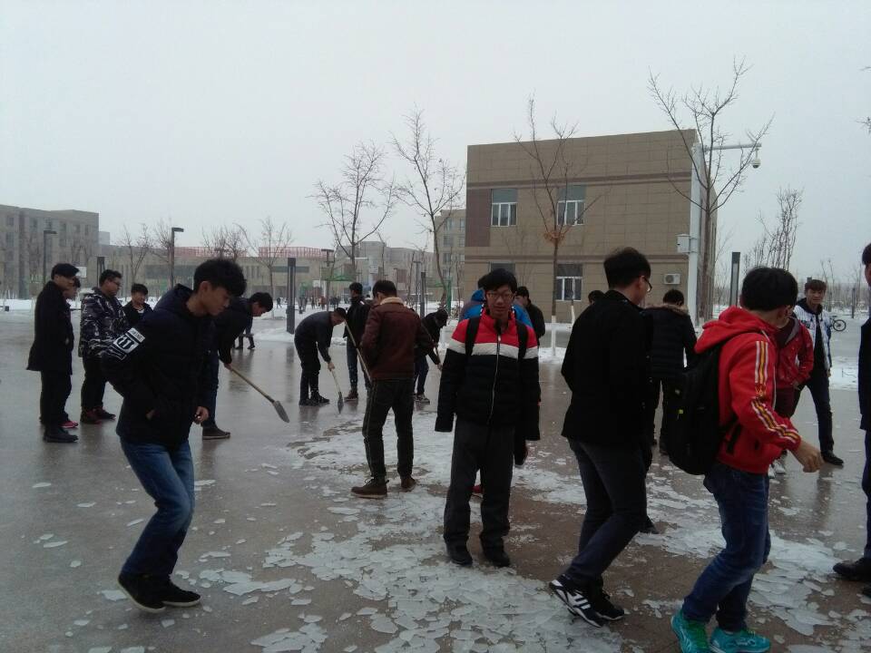 为响应系部号召,方便同学们出行,机械工程系化机1531班于12月5号下午在B7宿舍楼、B8开水房楼、B9清餐楼三处进行铲冰开路活动,本次活动由机械工程系系部制定路线,化机1531班全体男生共同参与此次活动。