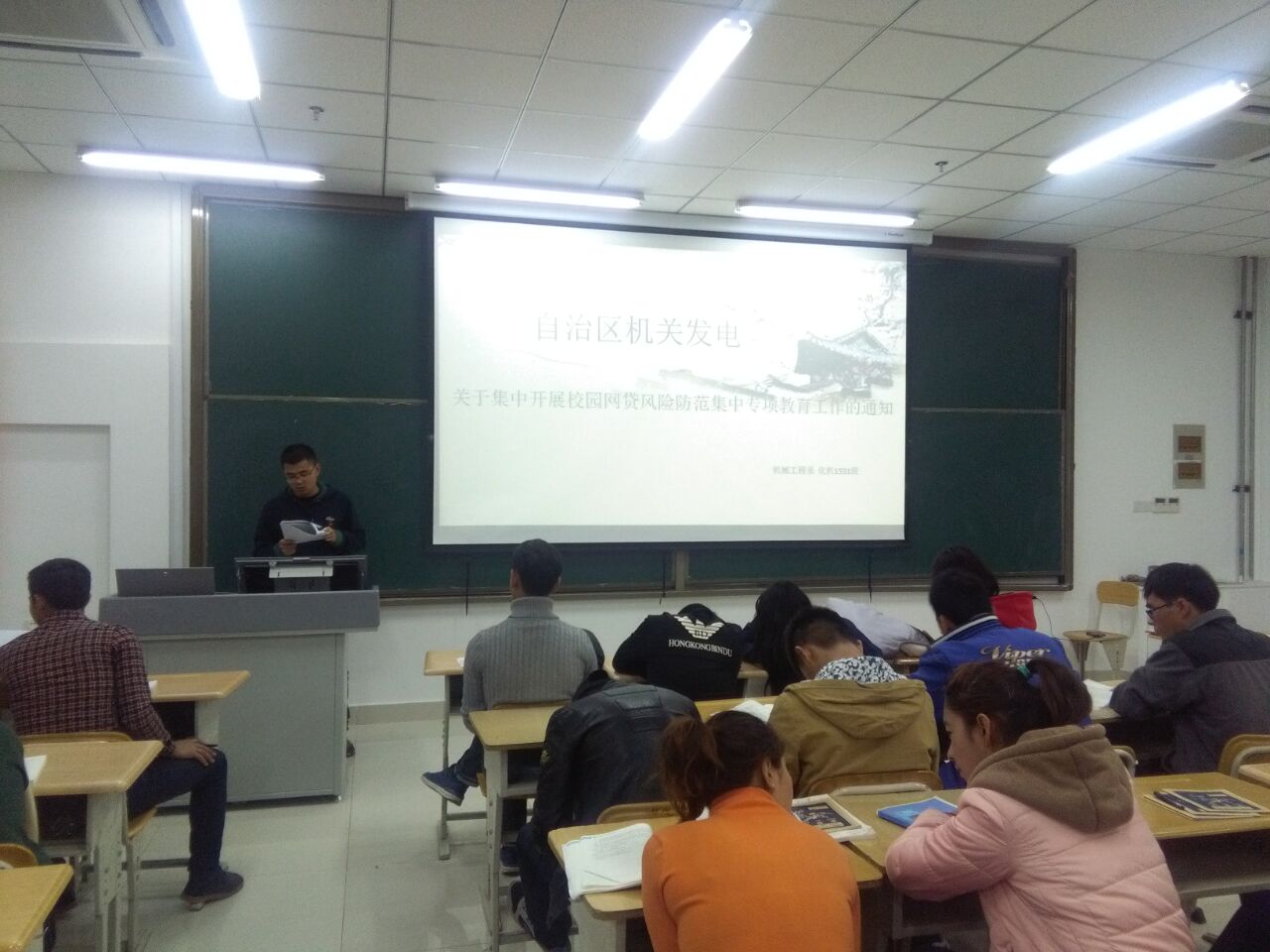 首先,主持人宋小城为同学们介绍了入团和入党的流程,为同学们展现了一个公平、公正、透明的选举和评定流程。接着,主持人为同学们介绍了入团与入党的用意所在,不仅提高自我修养,而且为自己以后的提升和发展打下良好的基础。最后,同学们共同学习了“校园网贷风险专项教育”,教育同学们理性网贷,杜绝超前消费,并为贫困生开出绿色通道,帮助同学们顺利完成学业。