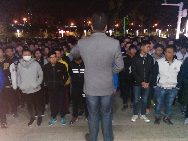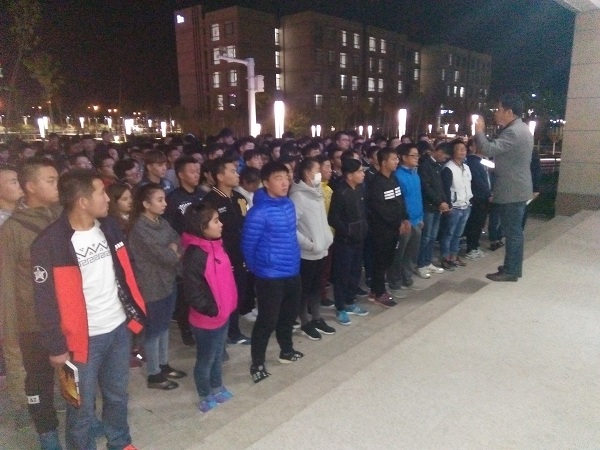 109,晚自习后机械工程系党支部书记李继霞与机械工程系全体大一新生在b1宿舍楼门口召开军训前动员大会.