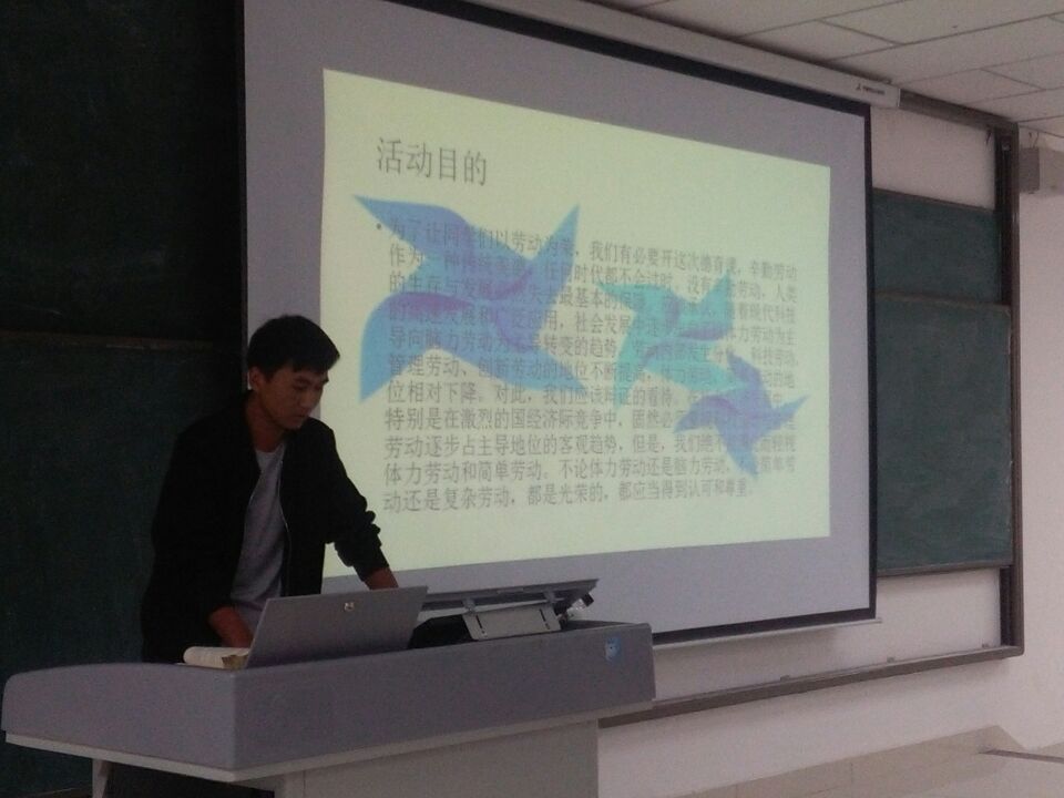 首先,主持人刘民汉同学为同学们解释了辛勤劳动的原因,打消同学们观念淡薄、鄙视劳动、得过且过、不求上进、盲目攀比等心理。紧接着,主持人告诫同学们不要有“遇事三分热”的思想,、只有踏实苦干,认真负责才能有真正的成就,实现价值。最后,辅导员老师钟梦娇做了最后的总结讲话,鼓励同学们从小事做起,才能为做大事作充分的准备。
