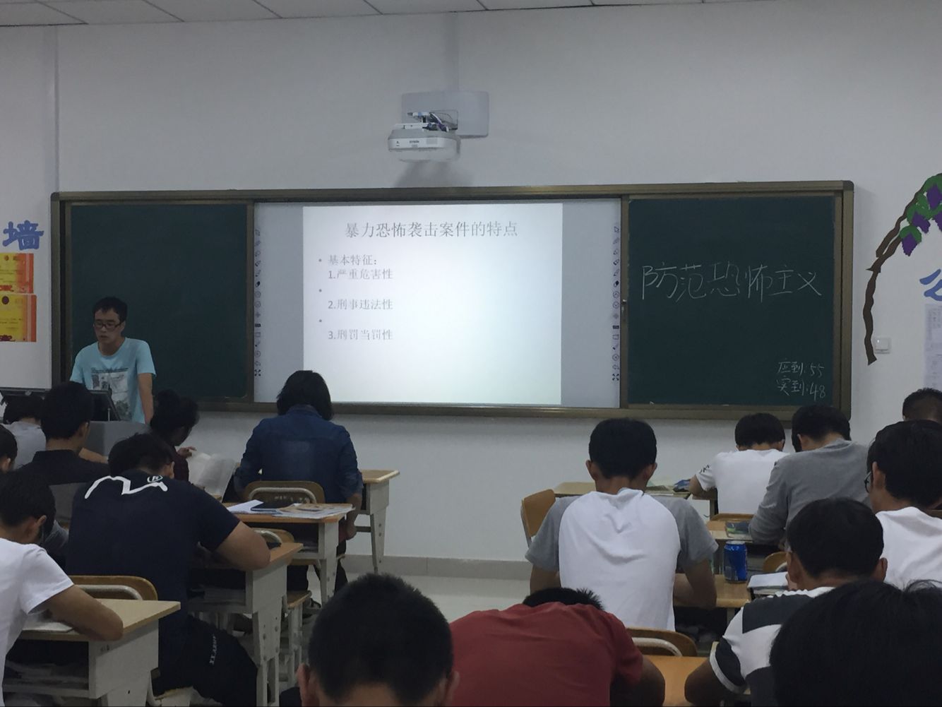 首先,主持人宋小成以图片的方式为同学展示了,恐怖分子的丑恶嘴脸和惨无人道,并且“深入的学习宣传反恐怖主义法 全力促进社会稳定”专项法治宣传教育活动。其次,通过视频让大家知道了校园内一些恐怖主义思想如何在校园内渗透与对同学们造成的危害。最后,同学们一起观看了各个高校利用网络、报刊、广播电视、微信、手机客户端等新闻媒介进行的反恐宣传活动。