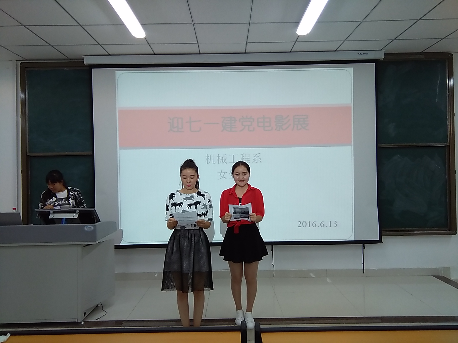 为激发同学们的爱国热情,弘扬爱国精神。机械工程系女生部于6月13日在C6-1-405教室开展"迎七一建党电影展"活动,本次展播由阿尔达古丽同学主持,机械工程系化机1531班、化机1532班及焊接1531班全体同学参加。