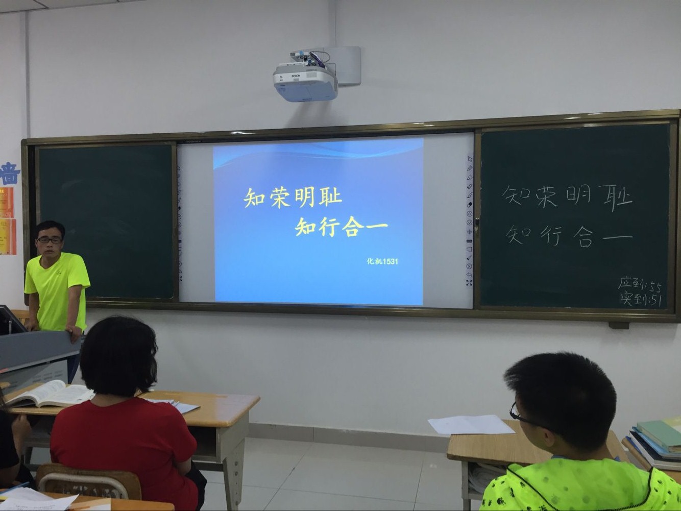 机械工程系化机1531班于6月1日在C6-1-308教室开展“知荣明耻,知行合一”德育活动课。此次活动课宋小城同学主持,班主任李继霞和化机1531班全体同学共同参加。