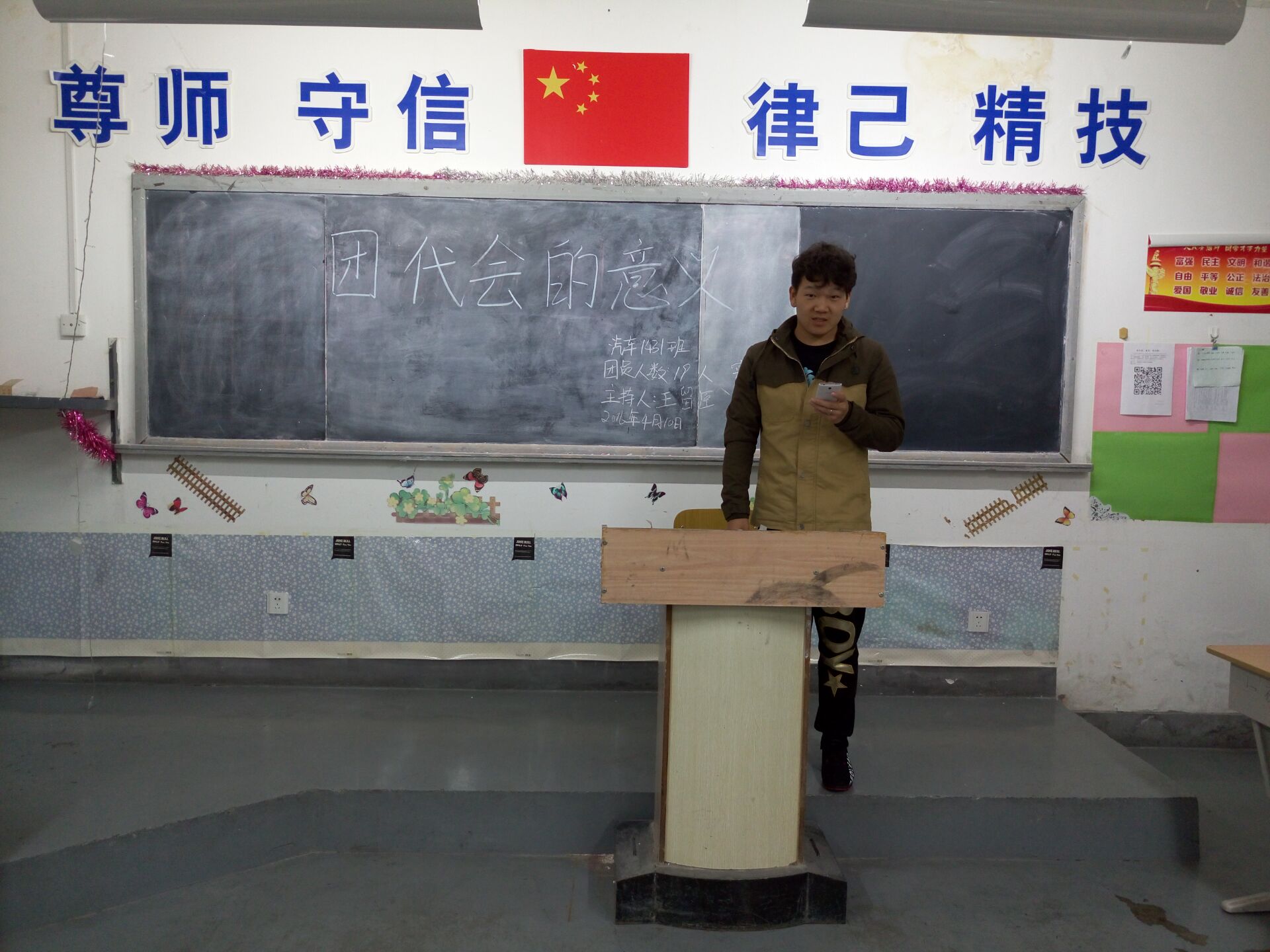 主持人王留臣同学为大家讲述了团代会是中国共产主义青年团团员代表大会的简称,团代会的主要任务是学习并讨论党中央和团中央的文件精神,以及团委委员的换届选举。团代会是按照团章规定从团中央到各级行政区域的各级地方团委、各具体基层单位团委团总支委、每年定期或者特殊情况下不定期召开的共青团团员代表大会。由于2016年是自治区民族团结进步年,所以在课堂上同时学习了梁超同志的讲话。